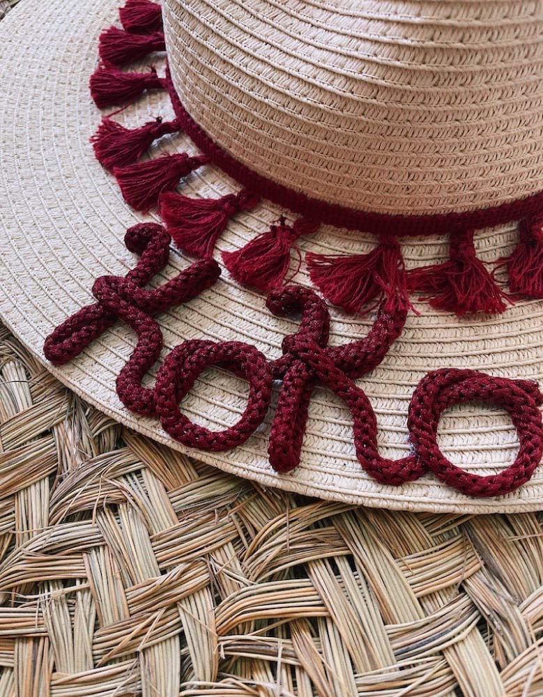 Nuestra pamela con borlas está hecha con fibra vegetal. Personalízalo con tu nombre (o la palabra que quieras) en algodón ecológico.
