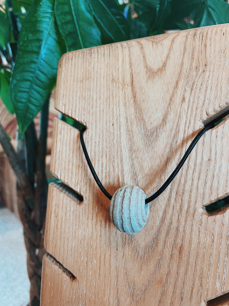 Collar con piedra grabada y cordón de cuero ajustable.